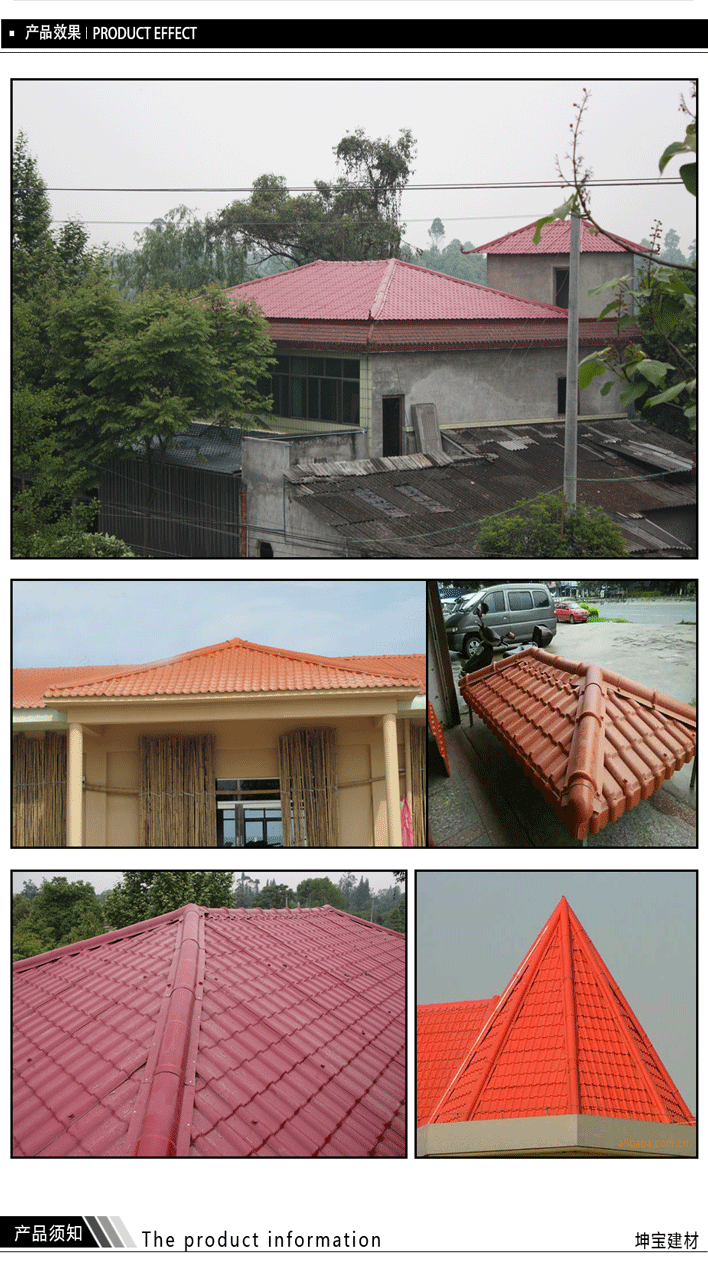本公司經(jīng)營(yíng)的合成樹脂瓦、秸稈瓦等產(chǎn)品品種豐富、顏色多樣,可滿足不同客戶的需求,《坤寶牌》合成樹脂瓦具有輕質(zhì),防水,堅(jiān)韌,保溫隔熱,隔音,抗腐蝕,抗風(fēng)抗震, 抗污,綠色環(huán)保,防火,絕緣,超長(zhǎng)壽命,安裝簡(jiǎn)便等優(yōu)點(diǎn),它突出的特點(diǎn)是色彩豐富并長(zhǎng)久不褪色,造型美觀立體感強(qiáng)且符合我國(guó)建筑文化特色。同時(shí),它還是各類永久建筑屋面裝飾和防火的理想材料,尤其適用于我國(guó)目前大力推廣的“城市形象工程改造”和“新農(nóng)村屋面工程”。