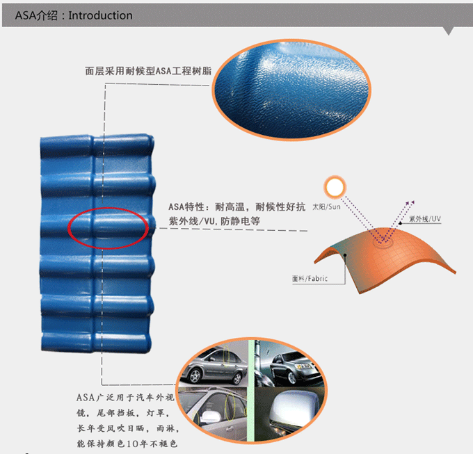 合成樹脂瓦表面材料是進(jìn)口的超高耐候工程樹脂制作而成。在自然環(huán)境中具有超常的耐久性,它即使長期暴露于紫外線、濕氣、熱、寒的惡劣條件下,仍能保持其顏色的穩(wěn)定性。根據(jù)美國亞利桑那州和佛羅里達(dá)州等日光照射強(qiáng)烈地區(qū)戶外使用結(jié)果證明,可以確保十年顏色變化△E≤5,是十分理想的新型屋面瓦。