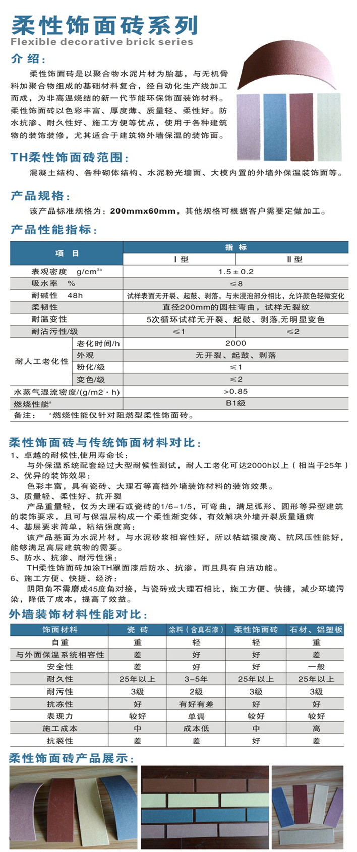操作性的新一代飾面裝飾材料。TH柔性飾面磚是外墻涂料、瓷磚最佳的替代材料,是建筑裝飾材料的一